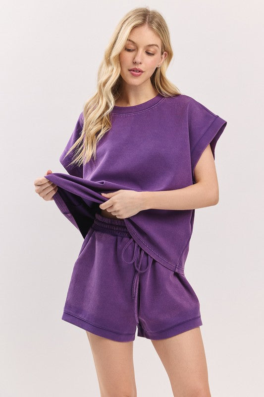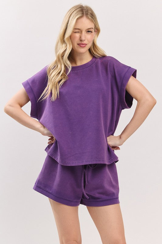 Cheer in comfort and style with this game day washed set featuring a relaxed-fit short sleeve top and matching drawstring shorts.