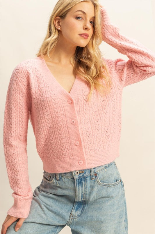 Embrace timeless style and comfort with this cable knit sweater, featuring a classic button front and a relaxed fit.