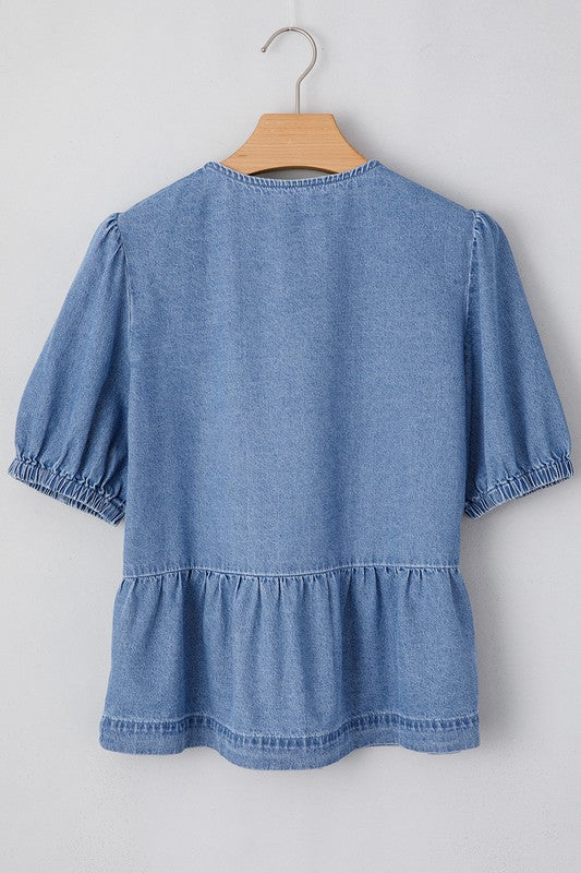 Blue Tied Front Bubble Sleeve Peplum Denim Shirt