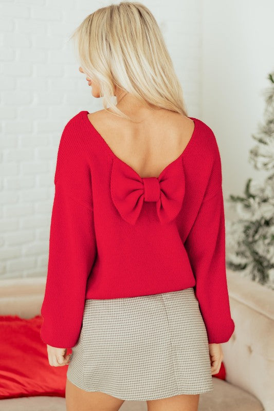 Festive bow backless bubble sleeve sweater.